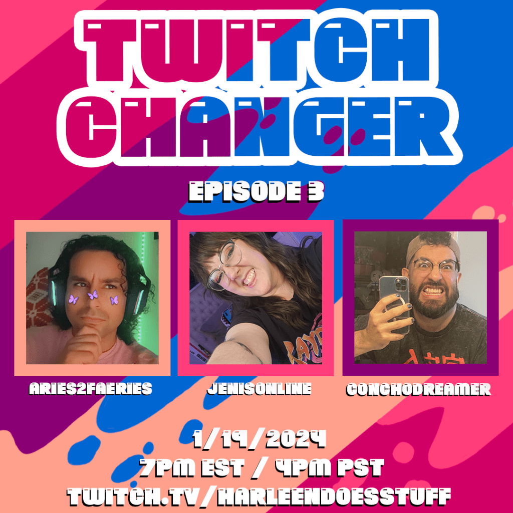 Twitch Changer is a monthly parody of Dropout TV‘s Game Changer, where myself and HarleenDoesStuff challenge queer streamers to improv comedy based game formats to compete for gay glory and silly prizes! Our aim is to provide queer comics a space to create entertainment we have systemically been excluded from existing, as standup comedy and improv comedy are (somehow) largely dominated by straight white men.